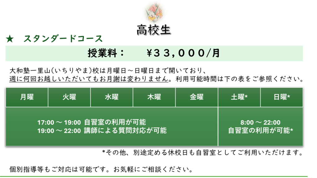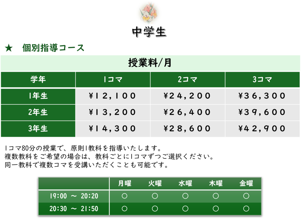 入塾金(初回のみ)、設備維持費(毎月3000円)を別途頂いております。