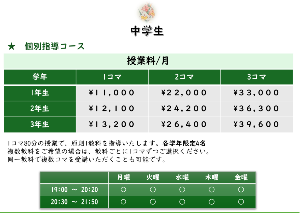 入塾金(初回のみ)、設備維持費(毎月 税込3300円)を別途頂いております。